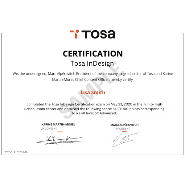The Tosa Certification for Adobe InDesign relies on a database of more than 150 questions. It is composed of a mix of 35 questions, including multiple-choice, interactive, and live in-the-application questions, and lasts 1 hour. The algorithm adapts to each answer of the candidates to adjust the difficulty level of the questions until they reach the exact definition of the candidates’ level by calculating the limit of their skills. Candidates receive a numeric score out of 1000 points associated to a proficiency level on a five-level scale. Candidates who score between 1 and 550 points don't earn the certification. They will not receive a diploma but a certificate of completion. Candidates who score 551 points or above earn the certification. They will receive a diploma by email within five (5) business days and are eligible to receive a Credly digital badge.