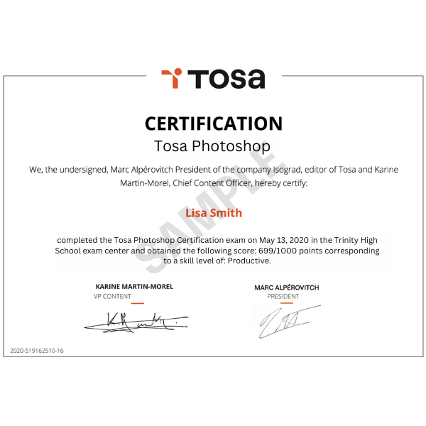 The Tosa Certification for Adobe Photoshop relies on a database of more than 140 questions. It is composed of a mix of 30 questions, including multiple-choice, interactive, and live in-the-application questions, and lasts 1 hour. The algorithm adapts to each answer of the candidates to adjust the difficulty level of the questions until they reach the exact definition of the candidates’ level by calculating the limit of their skills. Candidates receive a numeric score out of 1000 points associated to a proficiency level on a five-level scale. Candidates who score between 1 and 550 points don't earn the certification. They will not receive a diploma but a certificate of completion. Candidates who score 551 points or above earn the certification. They will receive a diploma by email within five (5) business days and are eligible to receive a Credly digital badge.