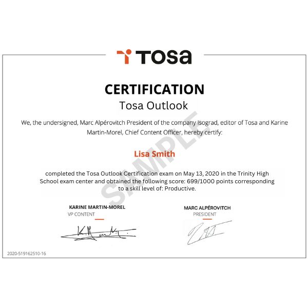 The Tosa Certification for Microsoft Outlook relies on a database of more than 90 questions. It is composed of a mix of 20 questions, including multiple-choice, interactive, and live in-the-application questions, and lasts 1 hour. The algorithm adapts to each answer of the candidates to adjust the difficulty level of the questions until they reach the exact definition of the candidates’ level by calculating the limit of their skills. Candidates receive a numeric score out of 1000 points associated to a proficiency level on a five-level scale. Candidates who score between 1 and 550 points don't earn the certification. They will not receive a diploma but a certificate of completion. Candidates who score 551 points or above earn the certification. They will receive a diploma by email within five (5) business days  and are eligible to receive a Credly digital badge.