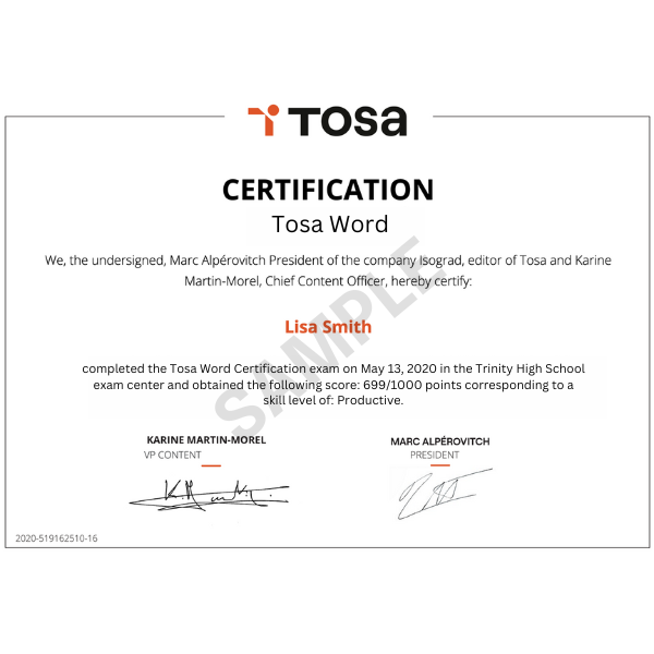 The Tosa Certification for Microsoft Word relies on a database of more than 250 questions. It is composed of a mix of 35 questions, including multiple-choice, interactive, and live in-the-application questions, and lasts 1 hour. The algorithm adapts to each answer of the candidates to adjust the difficulty level of the questions until they reach the exact definition of the candidates’ level by calculating the limit of their skills. Candidates receive a numeric score out of 1000 points associated to a proficiency level on a five-level scale. Candidates who score between 1 and 350 points don't earn the certification. They will not receive a diploma but a certificate of completion. Candidates who score 351 points or above earn the certification. They will receive a diploma by email within five (5) business days . If candidates score 551 points or above, they will also be eligible to receive a Credly digital badge.